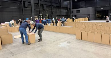 Aline Rosenbrand-Biesheuvel (links), Françoise Hendriks (midden) en Anne-Marie van Eeten (rechts) verzamelen 99 winterjassen voor vervoer naar Kleding- en Speelgoedbank ‘s-Hertogenbosch.